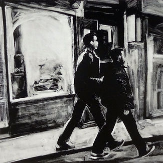 Lisbeth Firmin rides the line between abstraction and realism in contemporary American realist paintings and prints that explore the relationship between people and their environments. Her bold applications of energetic marks produce an abstract interplay of shapes that fall into place when viewed from a distance and reflect modern themes of isolation and disconnection.